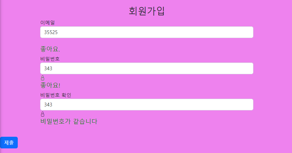 이메일에 규정에 맞게 작성되야만 다음 비밀번호가 활성화 , 비밀번호 확인도 마찬가지로 비밀번호가 활성화되면 접근할 수 있으며 비밀번호 칸과 비밀번호 확인칸이 같다면 제출버튼이 활성화되게 된다.