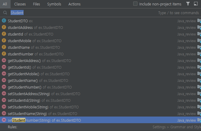 검색할 항목을 입력하면 클래스, 파일, 심벌 및 액션에 대한 결과가 표시된다.