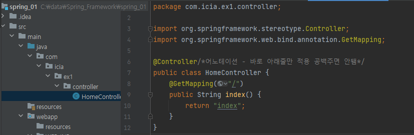 Controller 클래스에 @Controller로 어노테이션을 주고