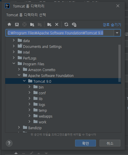 여기서 만약 권한부여를 하지 않았다면 Tomcat 9.0의 하위폴더가 보이지 않을 것이다.