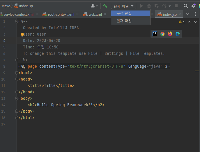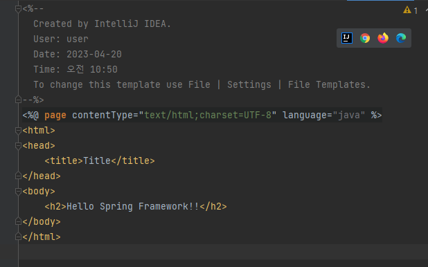 그 index 파일은 html문서처럼 생겼는데 여기서 h2로 Hello Spring Framework!! 를 출력해 보겠다.