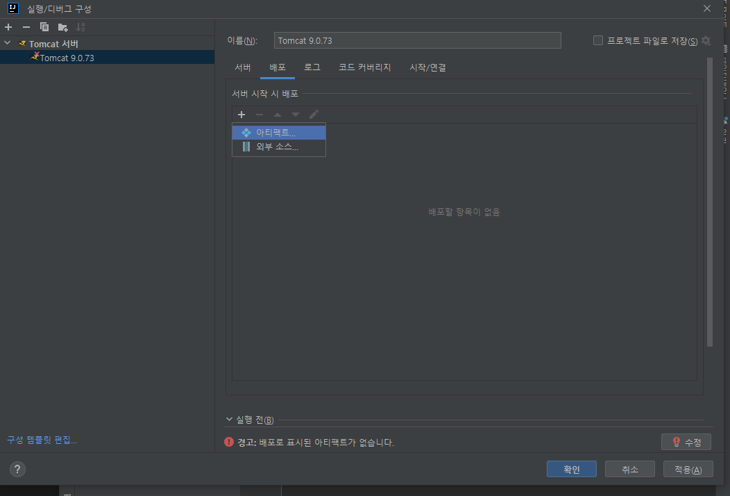 배포 창에서 + 선택 후 아티팩트 선택