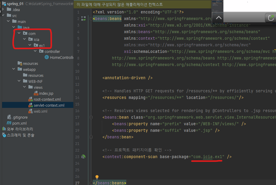 servlet-context.xml 파일에 패키지 이름 확인을 본 프로젝트의 패키지 이름으로 수정한다.