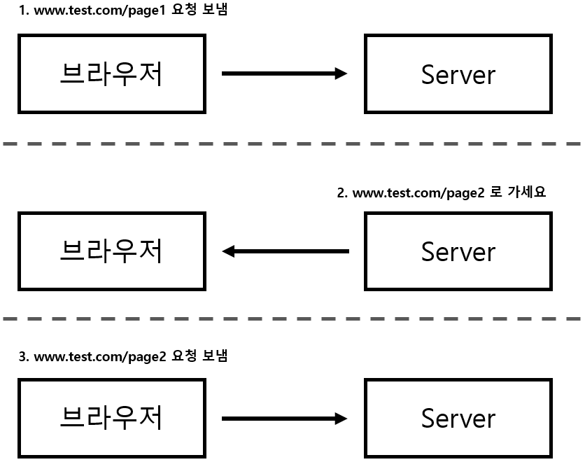www.test.com/page1 URL을 웹서버에 요청해서 서버는 HTTP 응답 메시지를 통해 www.test.com/page2로 로 다시 요청하라고 브라우저에게 다른 URL을 지시할 수 있다.