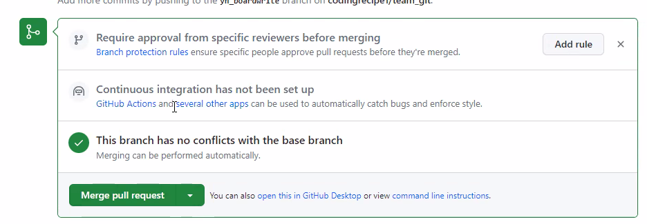 팀장은 pull request를 확인하여 merge 진행 ( 이 부분을 조심 )