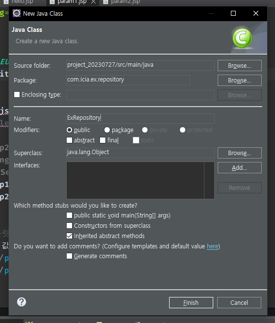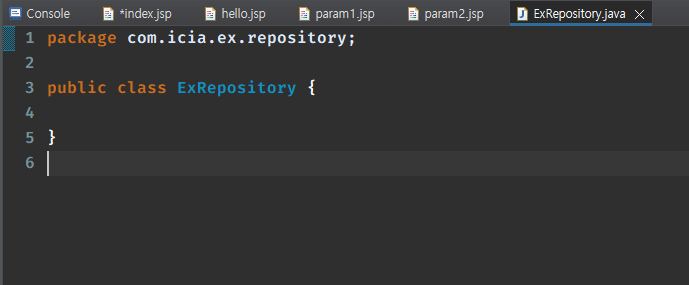 새로 만든 패키지 안에 ExRepository 라는 Class를 생성한다.