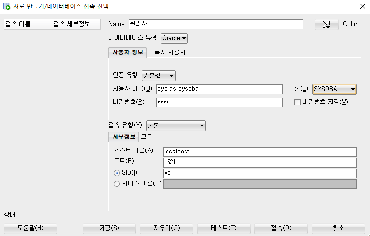 그리고 우측의 롤에서 SYSDBA를 선택한다.