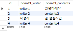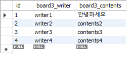 values(4, 'writer4', 'contents4');
