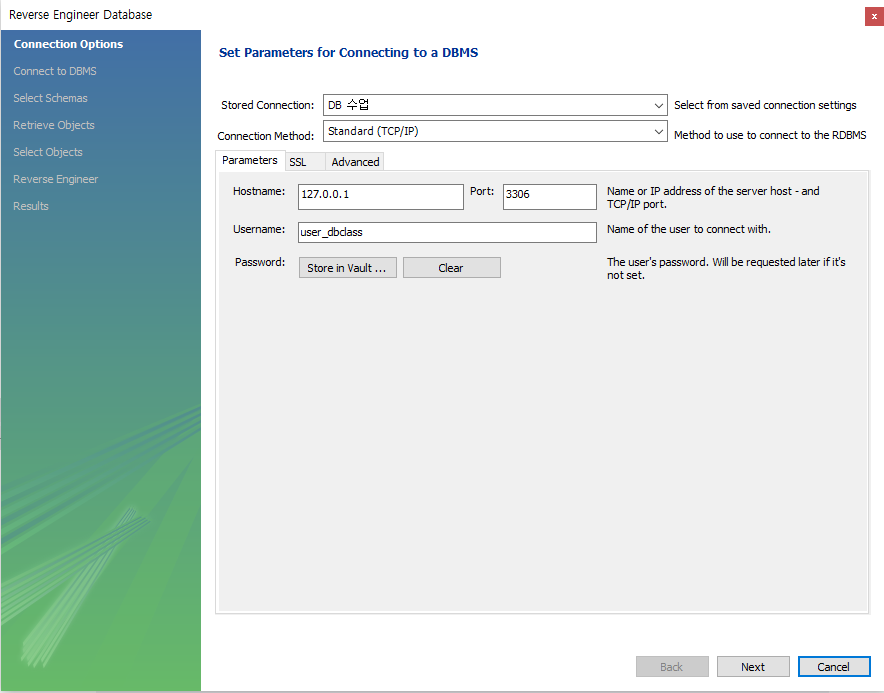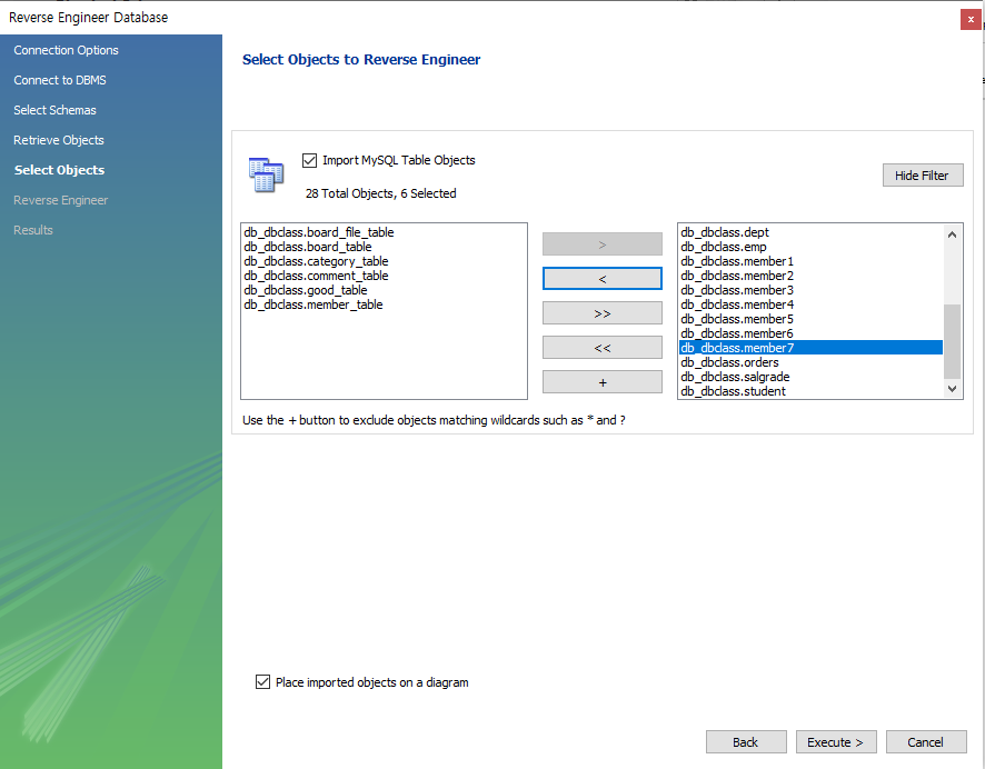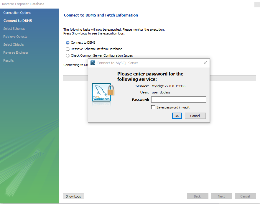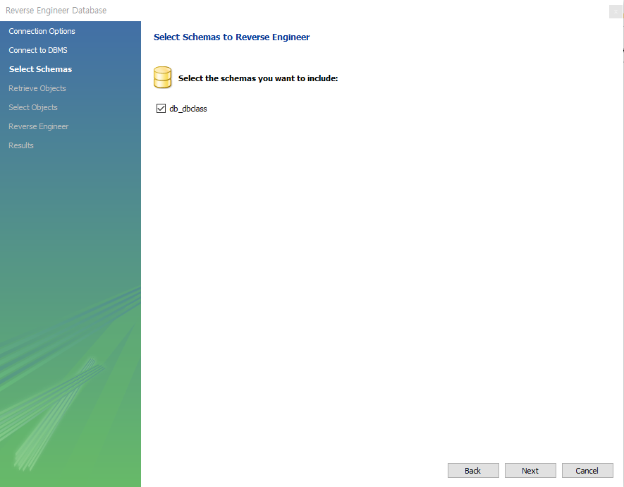ERD를 생성할 데이터베이스에서 Ctrl + R 을 누르면 Reverse Engineer Database 창이 나온다